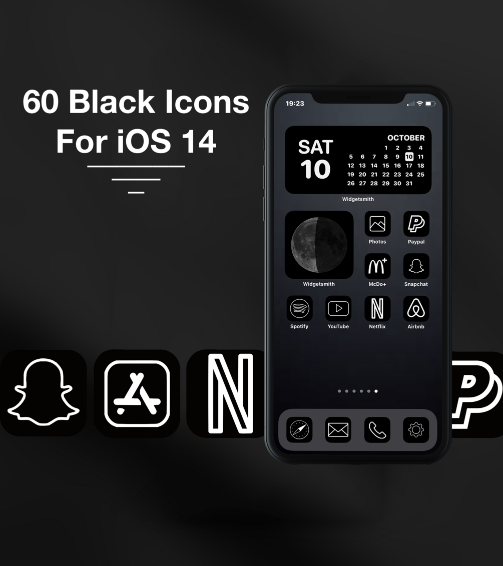 A beautiful set of 60 Full Black Classic app icons for your iOS 14 home screen. By buying this you can custom your iPhone and show to your friends how it looks with a brand new full Black home screen!